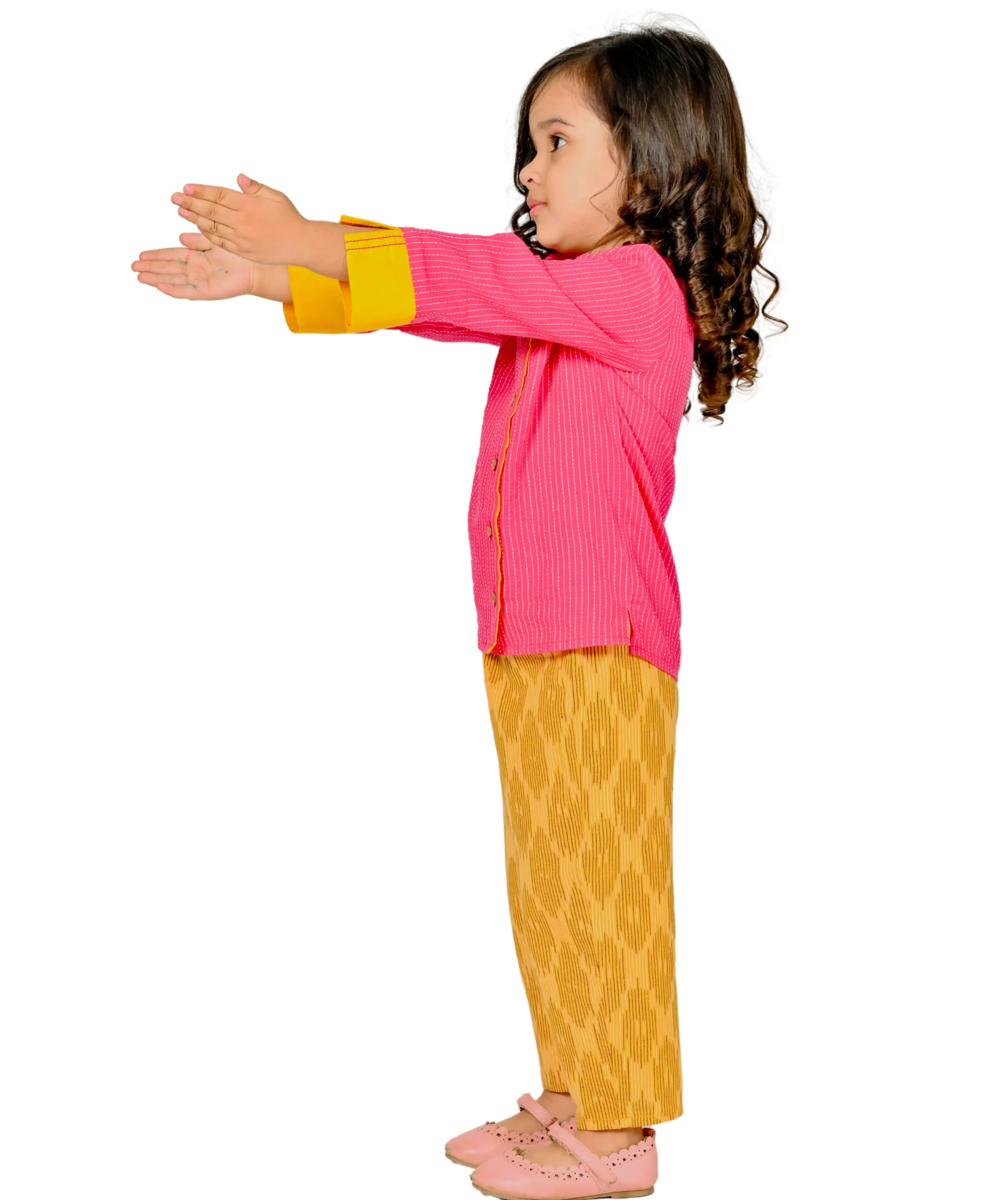 • (2) Green-Purple : The green & purple hand block printed cotton top features gathers at neckline and shoulder tie. The purple woven ikat cotton pyjama is elasticated at the waist.brics. The pink pure cotton hand block chevron print top features a round neckline with frill, is sleeveless and has a loop button opening at the back. The blue woven ikat cotton pant is elasticated at the waist.