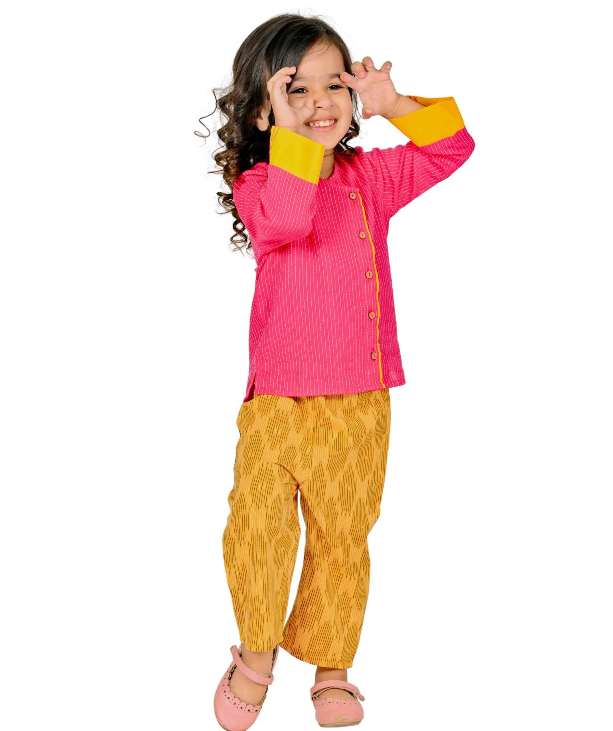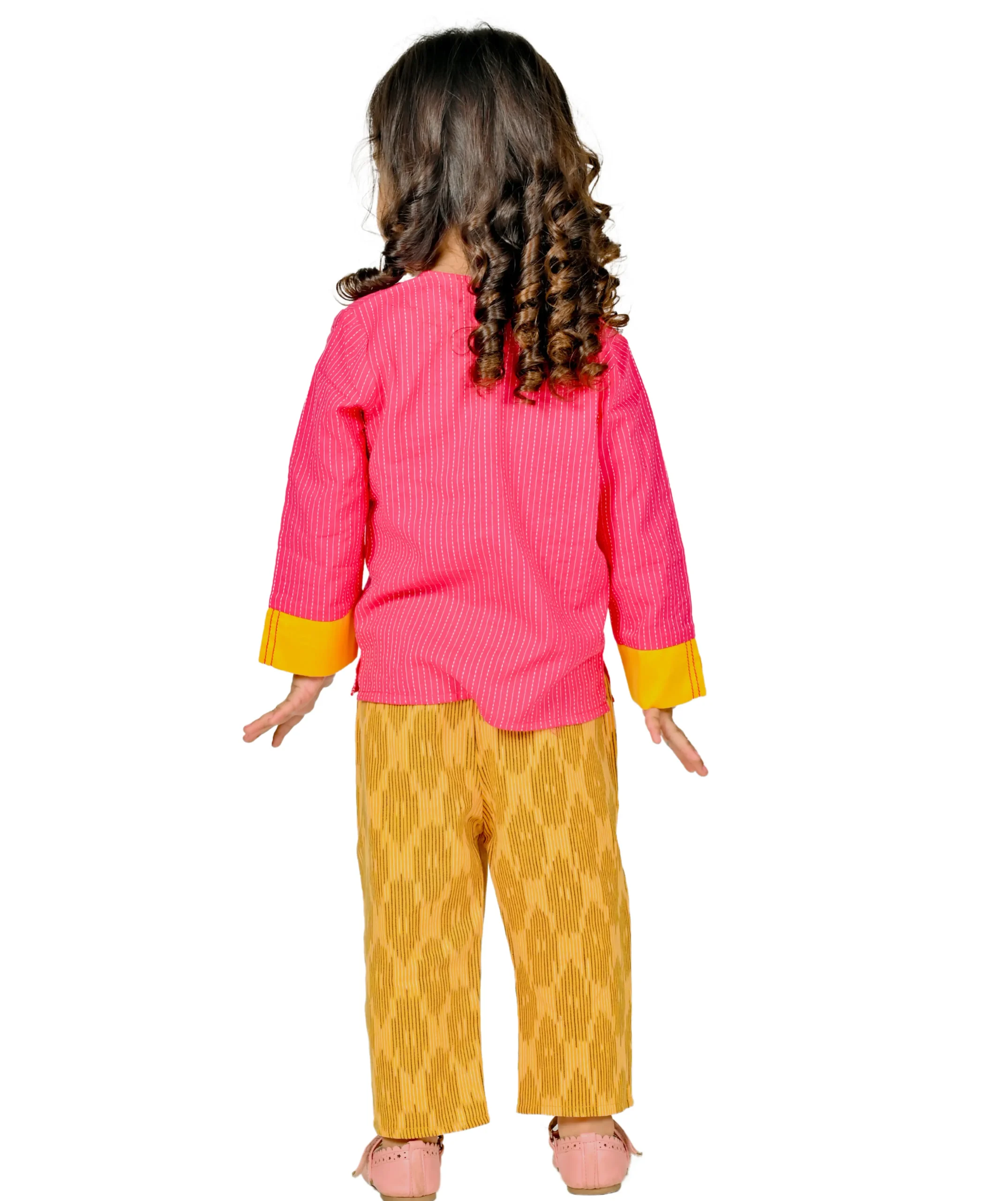 • (1) Pink-Blue : Clothes for toddlers serving comfort, happiness & practicality. Crafted in woven pure cotton, the blue leheriya printed top features a V- angarakha neckline, half sleeves with pink trims and front loop button opening. The pink leheriya printed pure cotton pant is elasticated at the ankle & waist.